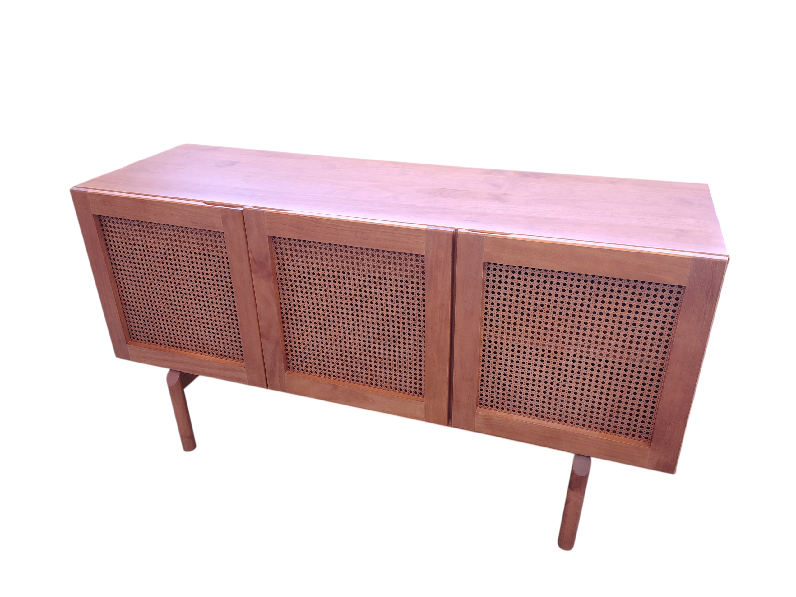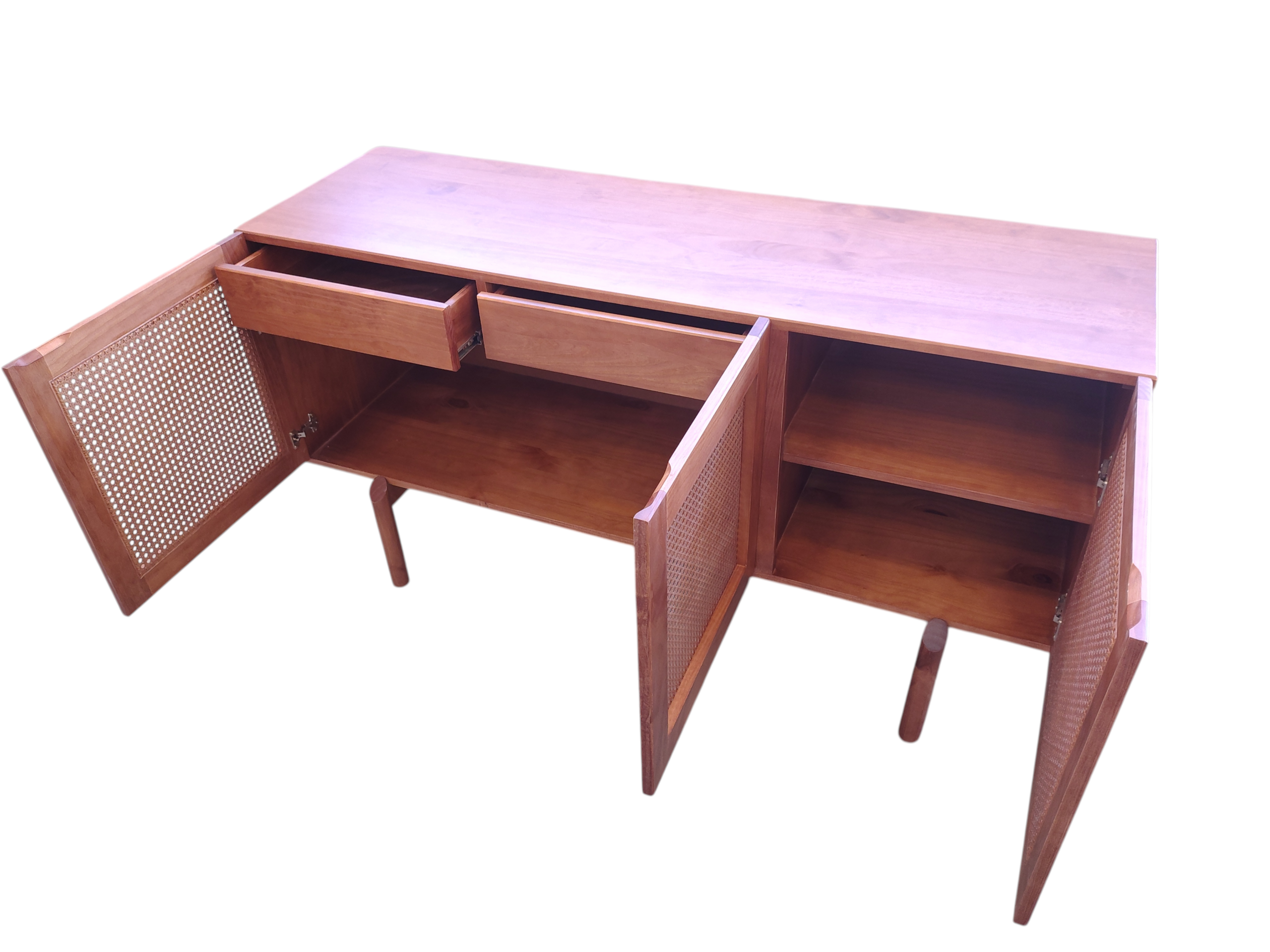 Produto em madeira maciça taeda com rattan sextavado nas portas, dobradiças de metal. Dentro contem duas gavetas e prateleiras de madeira.
